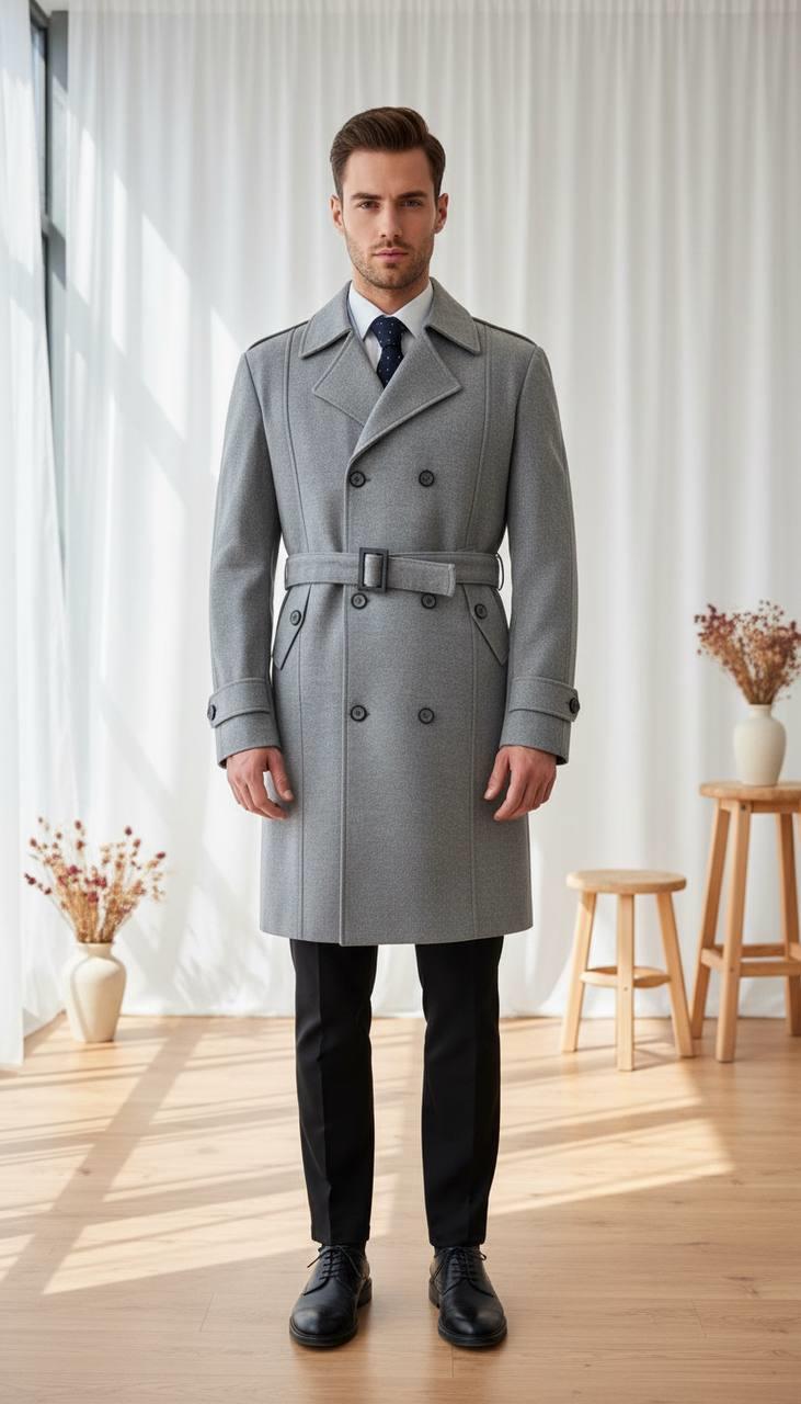 Erkek Kuşaklı Kruvaze Trençkot Kaban Gri SD42235