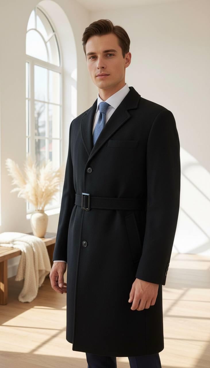 Erkek Siyah Kuşaklı Uzun Palto SD42238