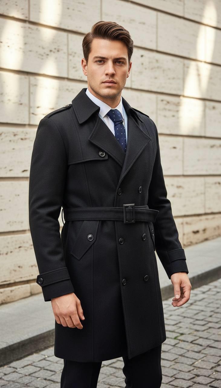 Erkek Kuşaklı Kruvaze Trençkot Kaban Siyah SD42233
